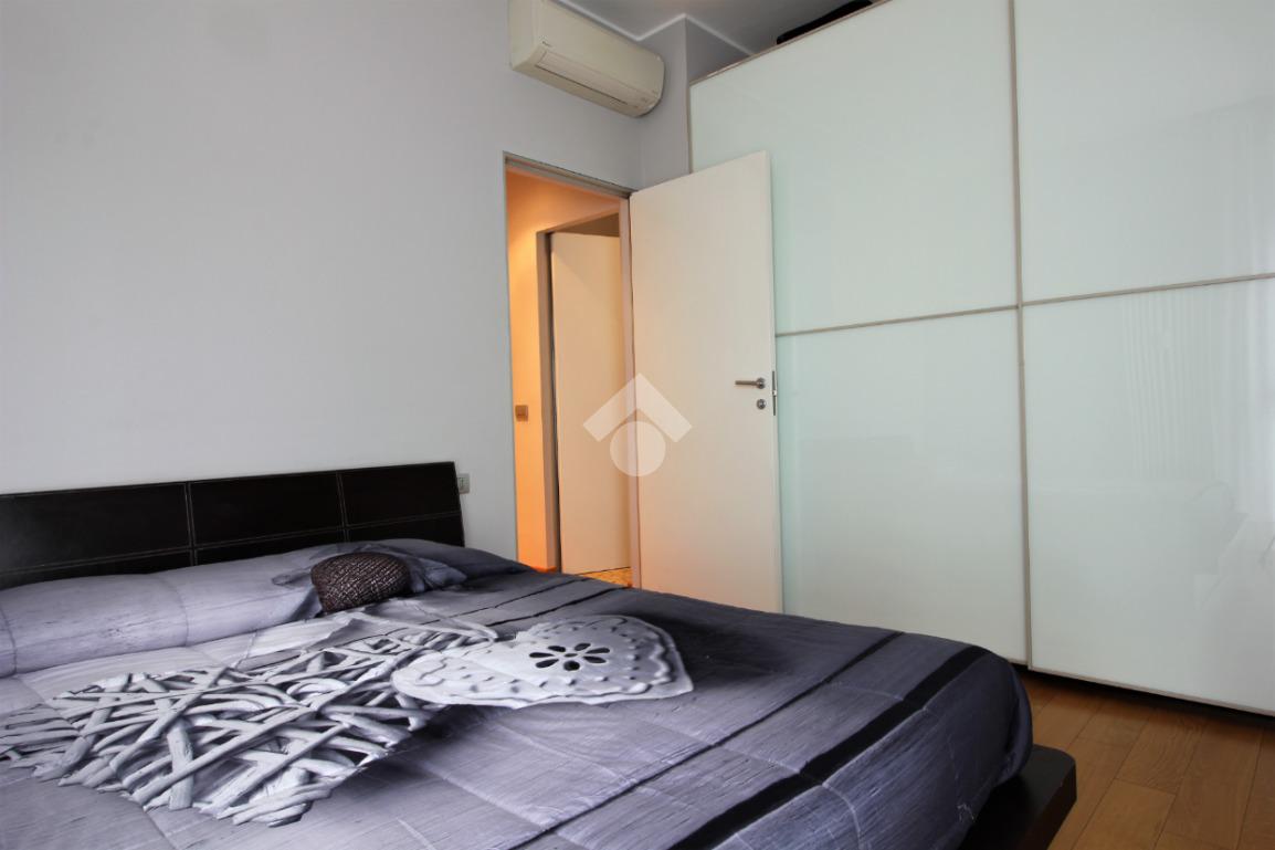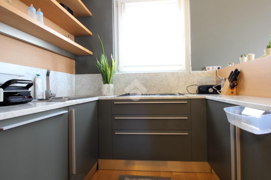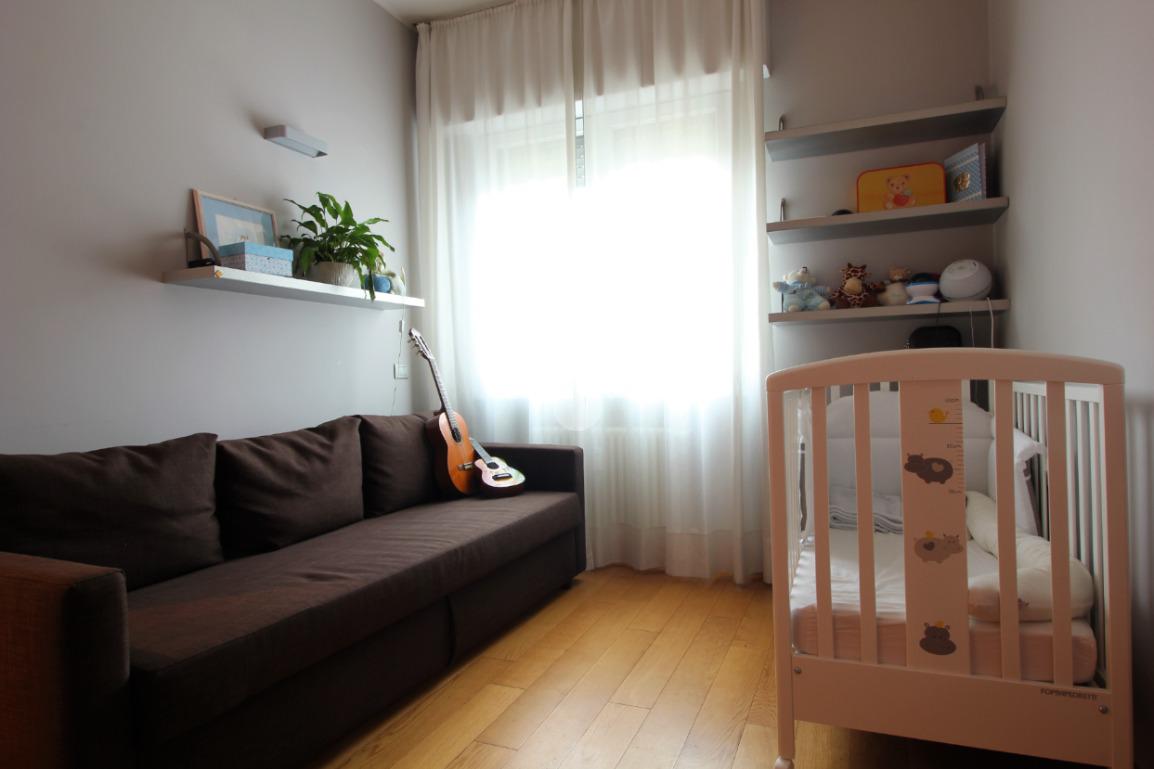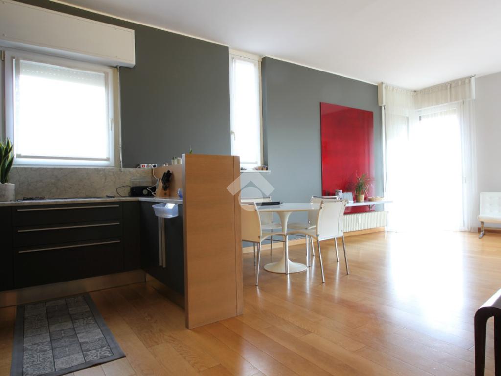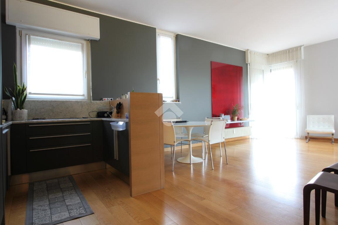 Luminoso trilocale di mq. 112 sito al quinto piano, composto da igresso, soggiorno doppio con sala da pranzo e cucina a vista, balcone di ca. 7 due camere matrimoniali e doppi servizi. Completa la proprietà la cantina. Pavimenti in parquet, infissi in pvc con doppi vetri, zanzariere e aria condizionata.