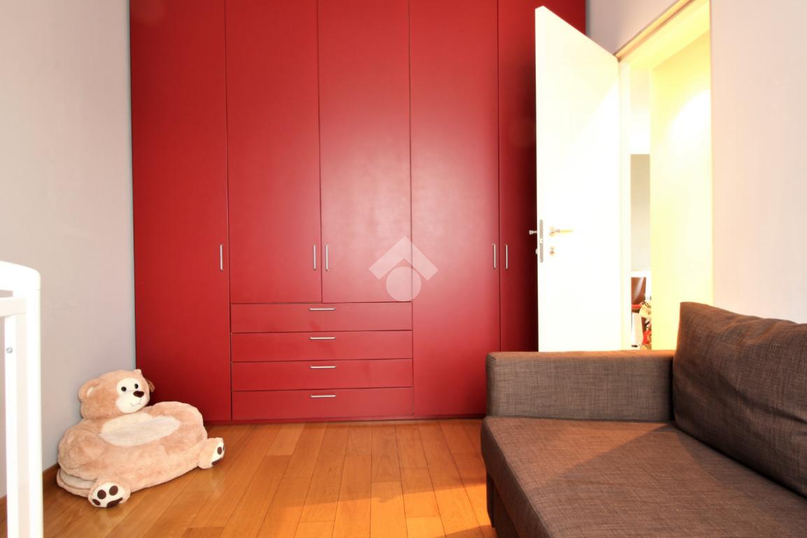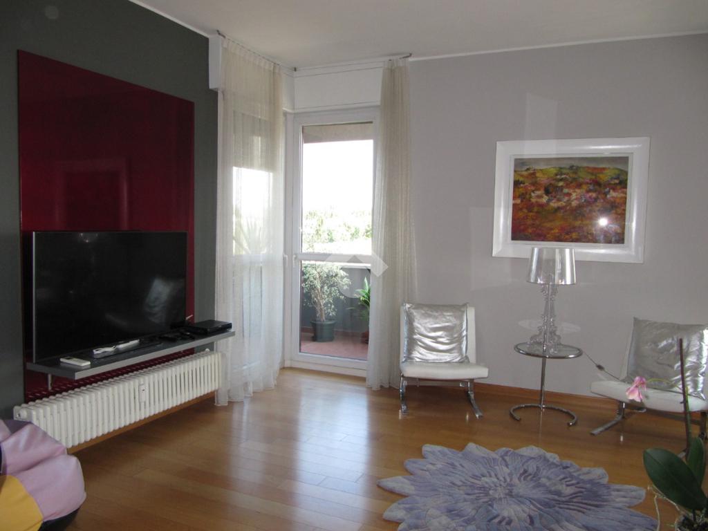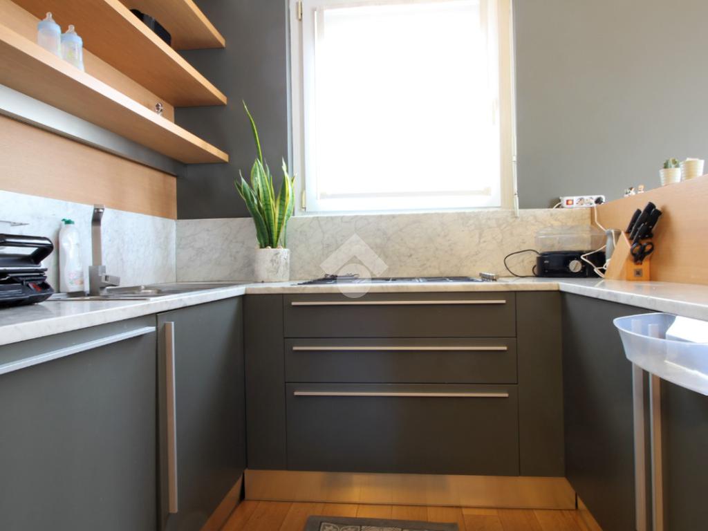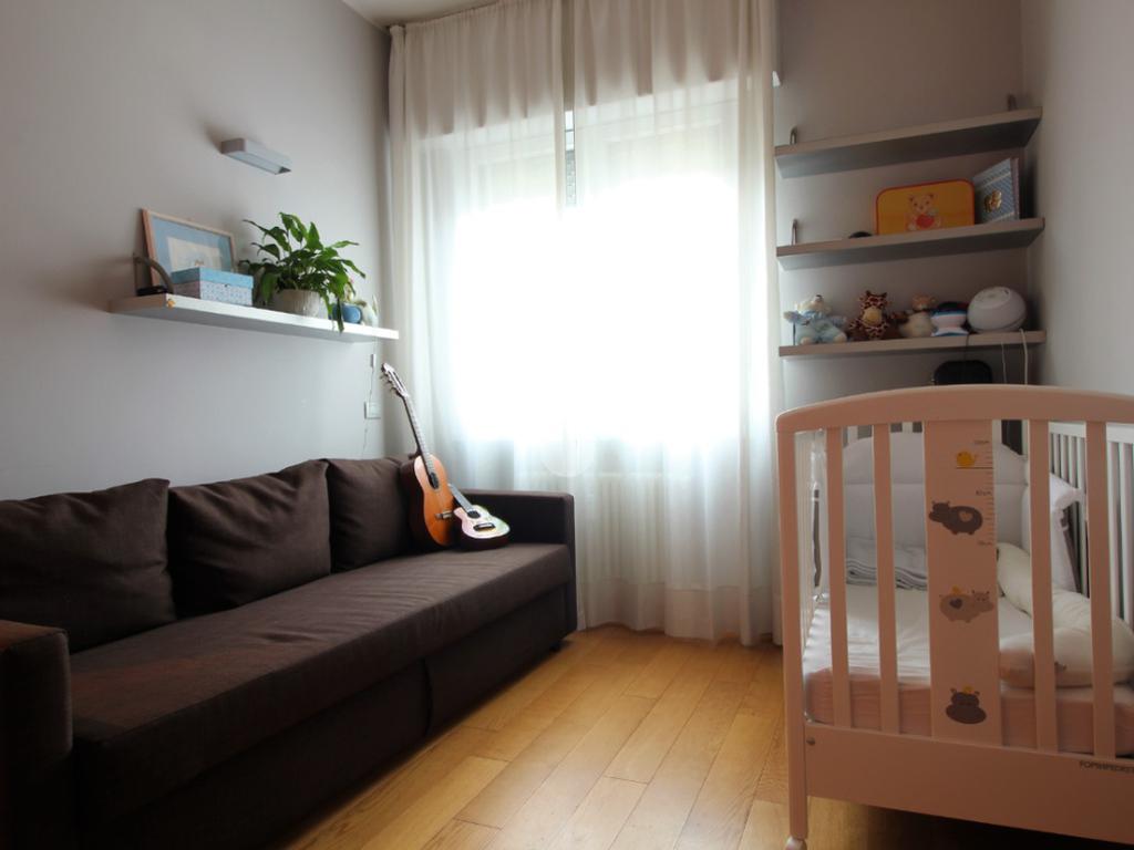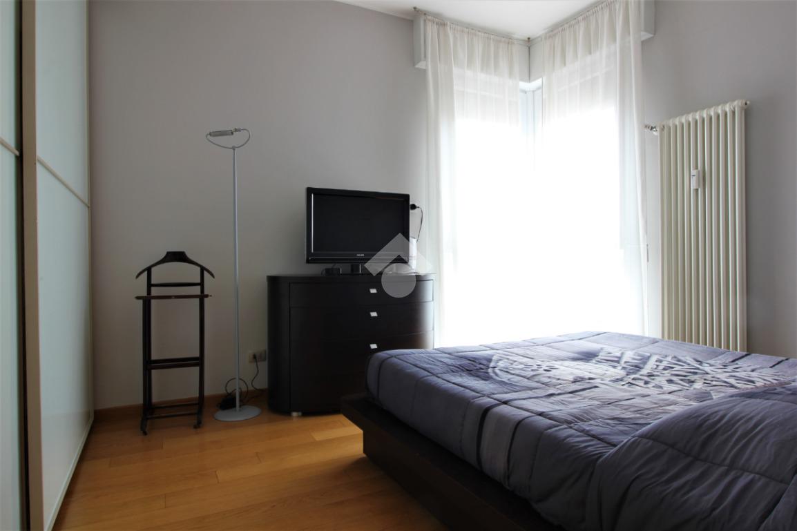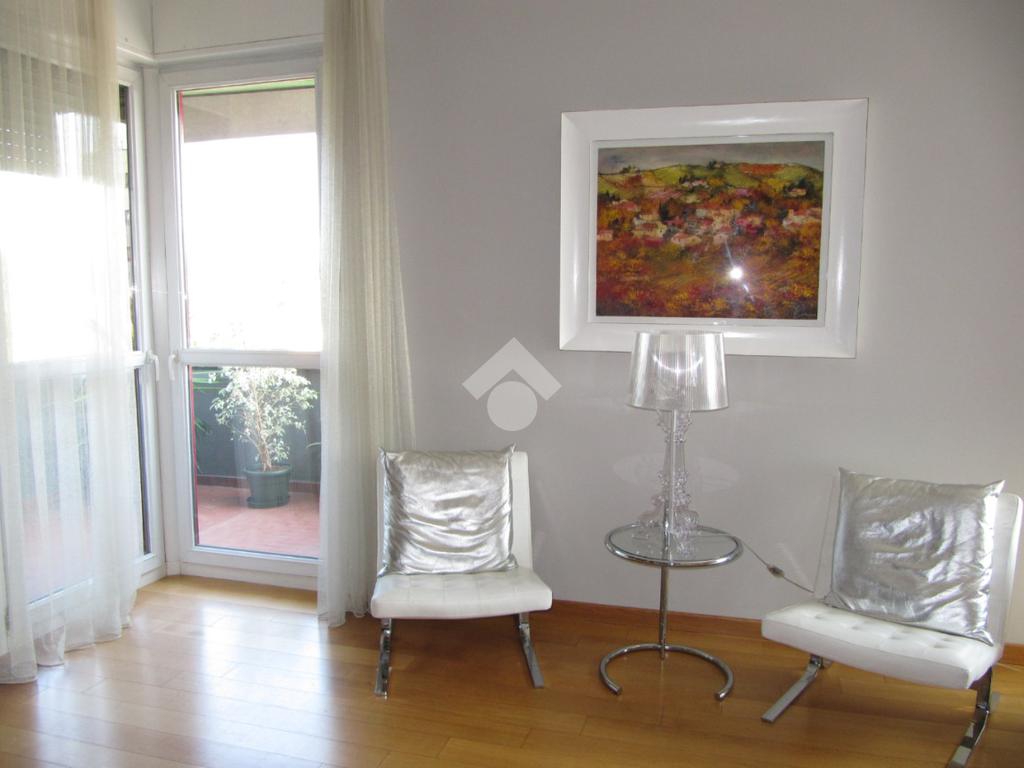 Luminoso trilocale di mq. 112 sito al quinto piano, composto da igresso, soggiorno doppio con sala da pranzo e cucina a vista, balcone di ca. 7 due camere matrimoniali e doppi servizi. Completa la proprietà la cantina. Pavimenti in parquet, infissi in pvc con doppi vetri, zanzariere e aria condizionata.